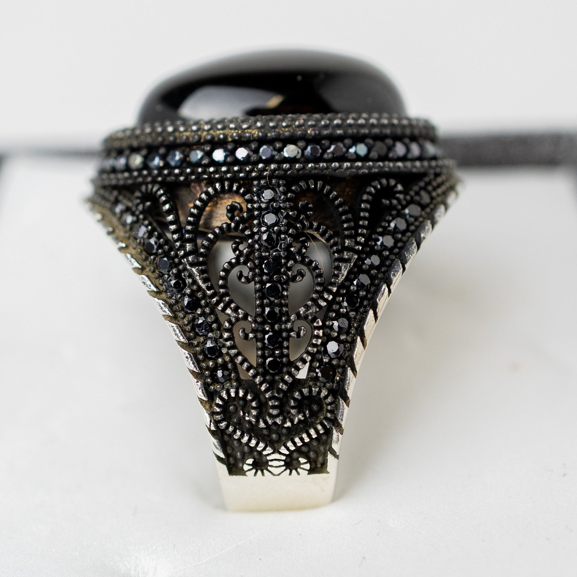 Questo anello è un pezzo unico che incarna forza, eleganza e mistero. Il nero intenso dell'Onice incontra la brillantezza degli Zirconi in una composizione che cattura lo sguardo con raffinatezza e carattere.