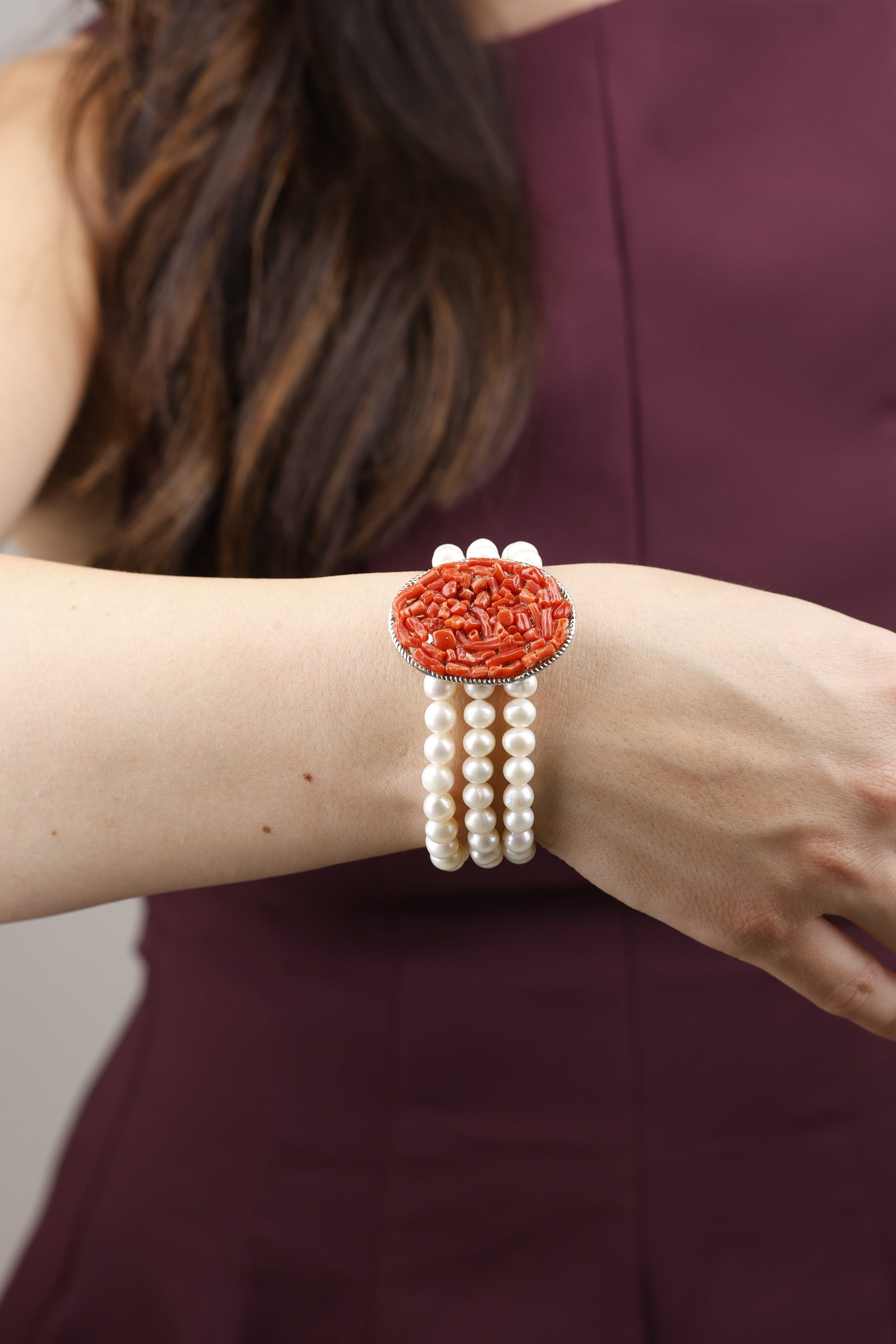Le tre file di Perle naturali scorrono armoniosamente in un abbraccio elastico, mentre il cuore centrale in Corallo Mediterraneo emerge come simbolo di vita e passione.