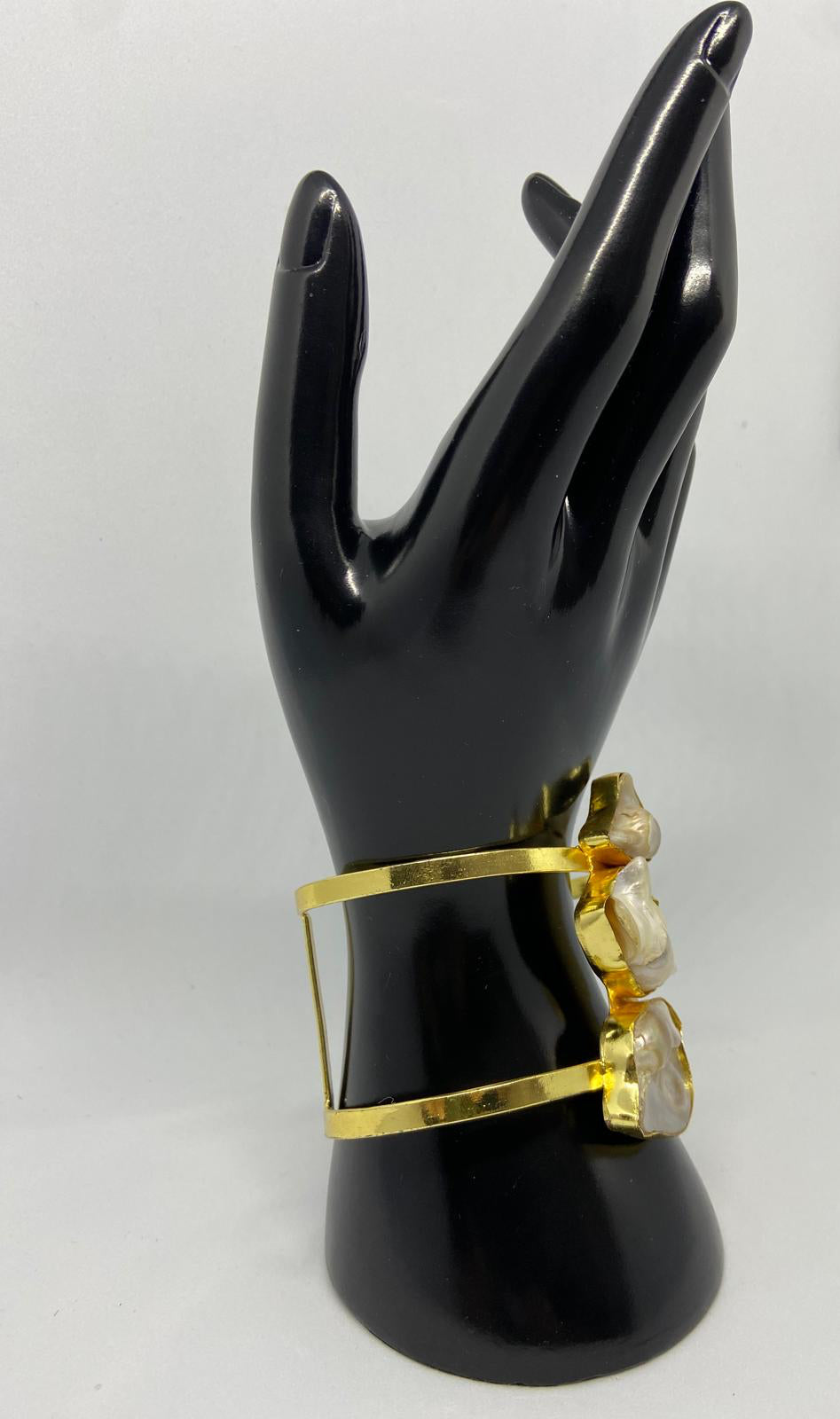 Tre perle scaramazze, ognuna con la propria forma irregolare e luce unica, si adagiano su una base dorata come conchiglie d’oro che custodiscono la loro essenza.