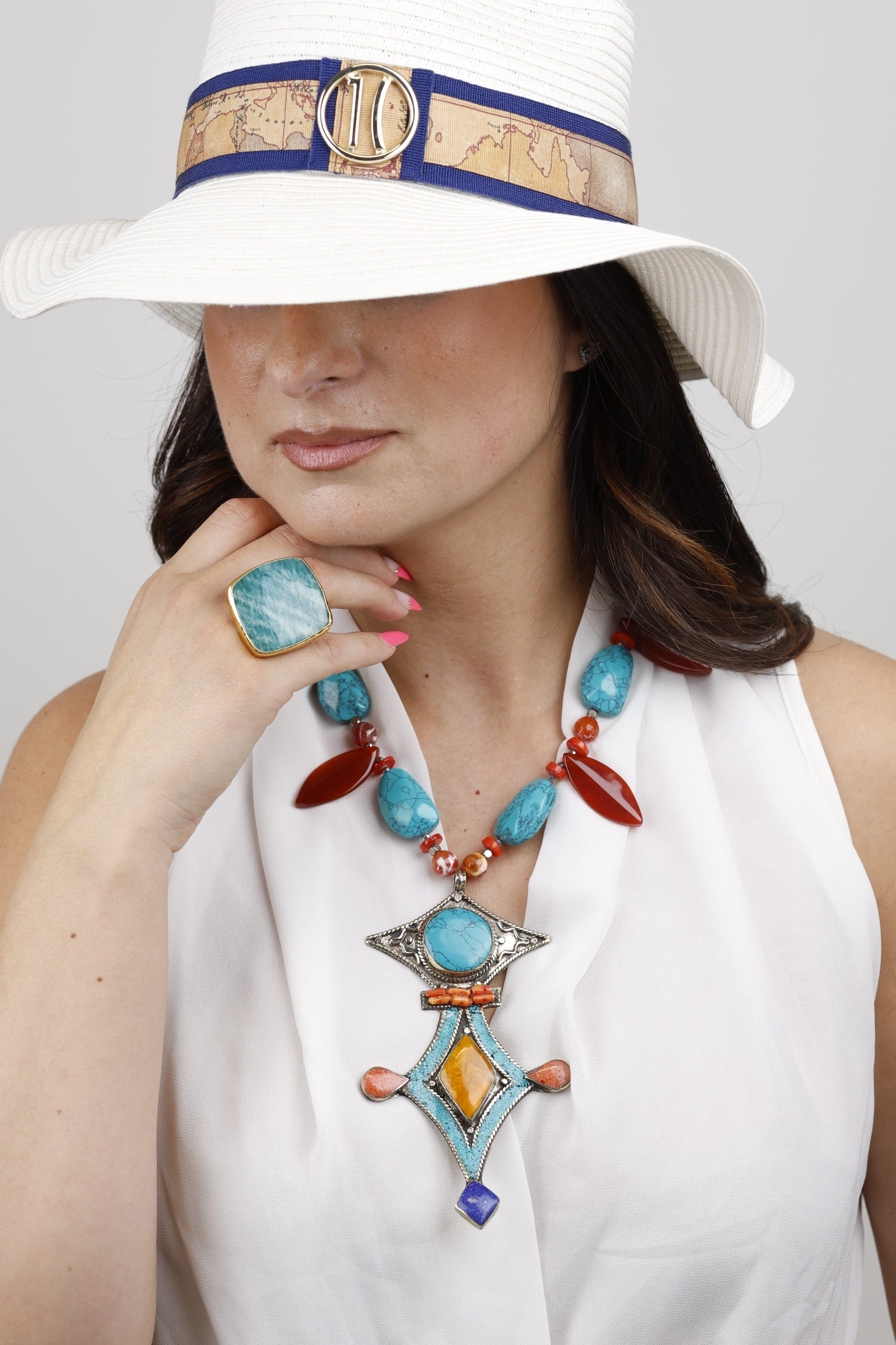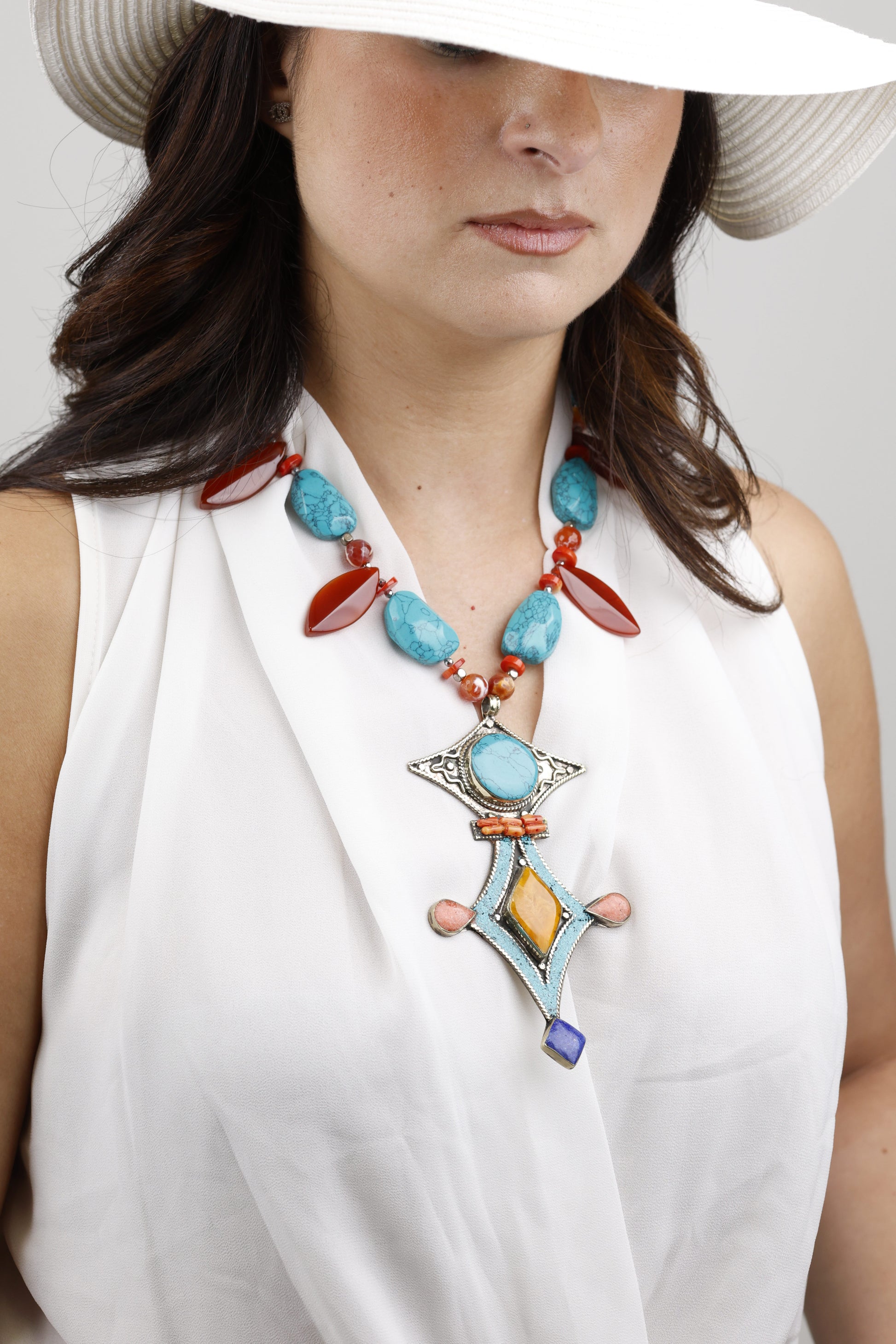 Il ciondolo centrale, impreziosito da dettagli in Argento 925, diventa il cuore simbolico della creazione, esaltando la preziosità delle pietre e donando un’eleganza senza tempo.