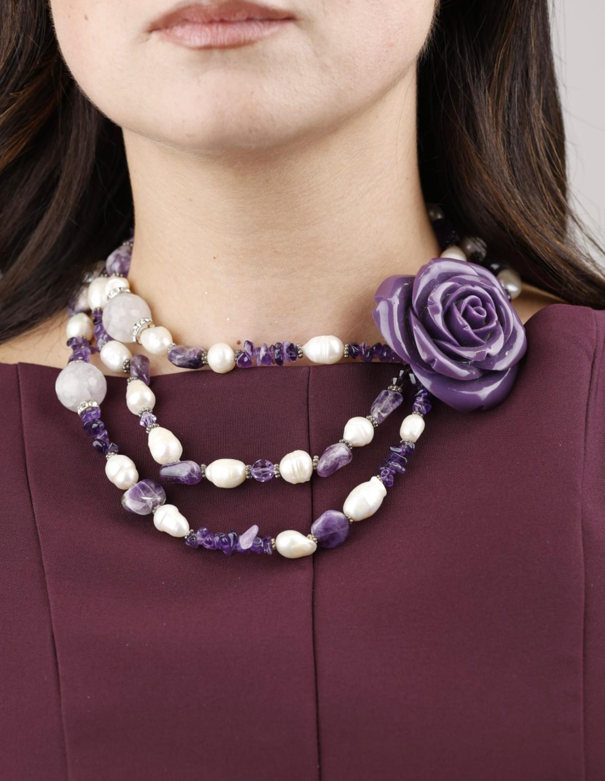 Questo girocollo a tre file intreccia perle naturali barocche, Ametista velluto del Brasile e dettagli luminosi che creano un movimento armonioso e raffinato.