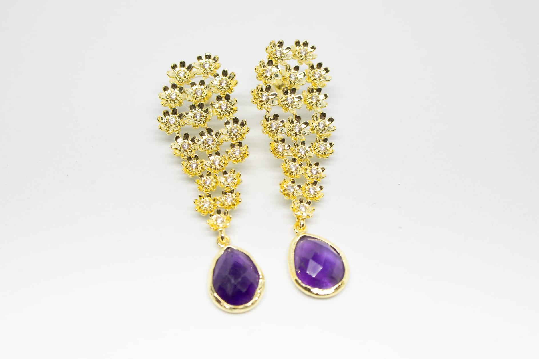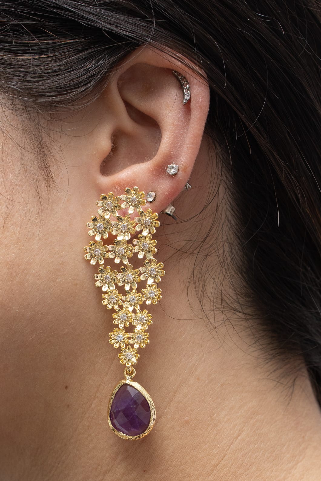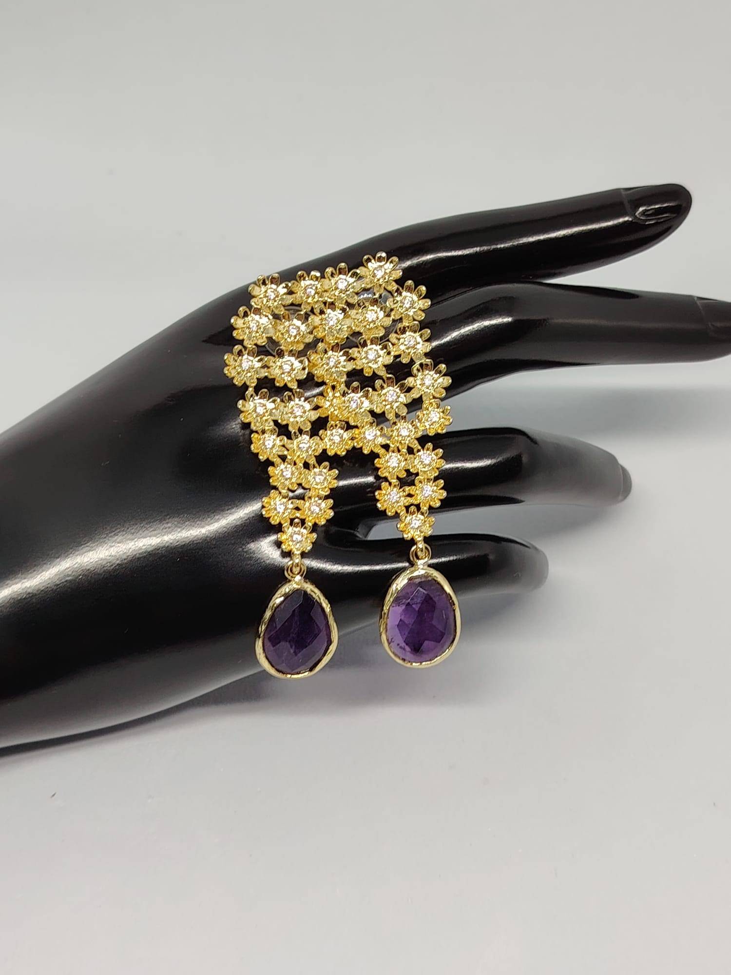Dalla filigrana floreale scendono due gocce di Ametista brasiliana, tagliate con sfaccettature morbide che esaltano il loro viola profondo e magnetico.