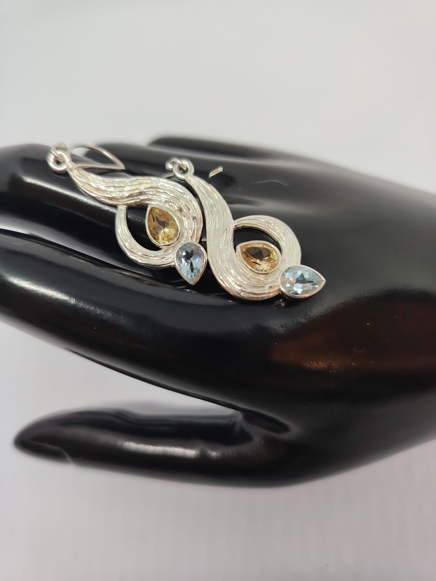 una nota musicale in Argento 925 rodiato si intreccia con due gemme che sembrano vibrare al ritmo della vita — una goccia dorata di Quarzo Citrino e una di Topazio azzurro.
