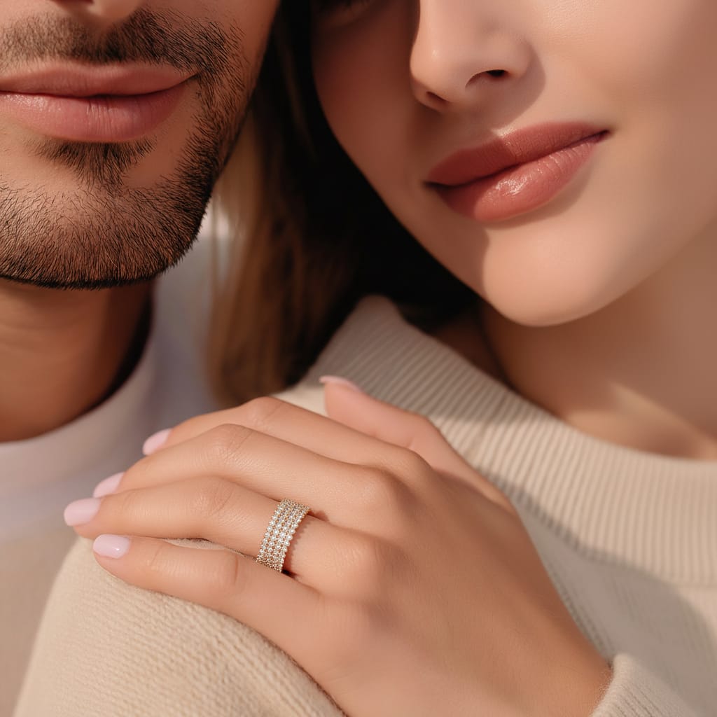 Un anello fascia larga che cattura la luce con un elegante pavé di zirconi scintillanti, perfetto per chi ama brillare con raffinatezza.