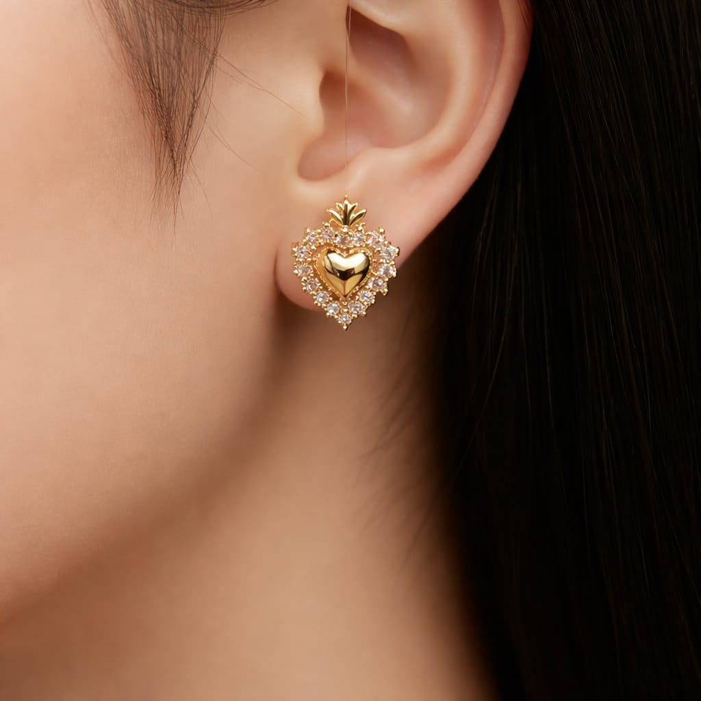 Orecchini eleganti a forma di cuore impreziositi da una corona decorativa e un contorno di pavé di zirconi scintillanti, perfetti per celebrare l'amore con stile.